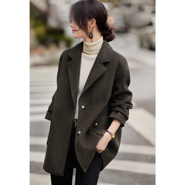 SEIFINI 诗凡黎绵羊毛翻领双排扣毛呢外套赫本风长款气质双面呢大衣