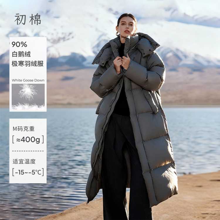 初棉 【冰岛极寒】90白鹅绒御寒长款过膝羽绒服女25秋冬连帽鹅绒服