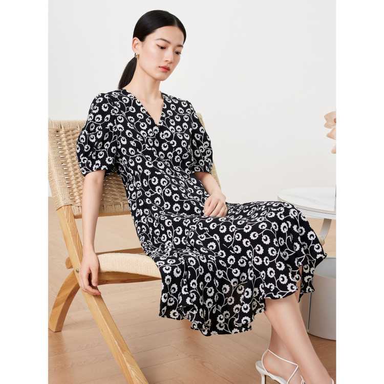玖姿安娜蔻 玖姿夏季轻盈雪纺印花系带V领度连衣裙