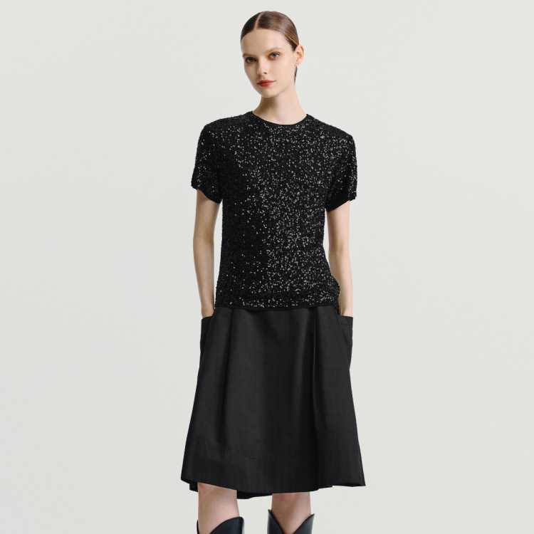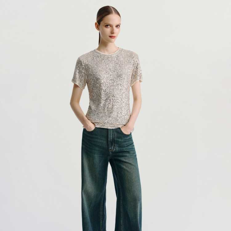 Havva 高级感精致亮片圆领短袖T恤弹力舒适好穿女士上衣2026春夏