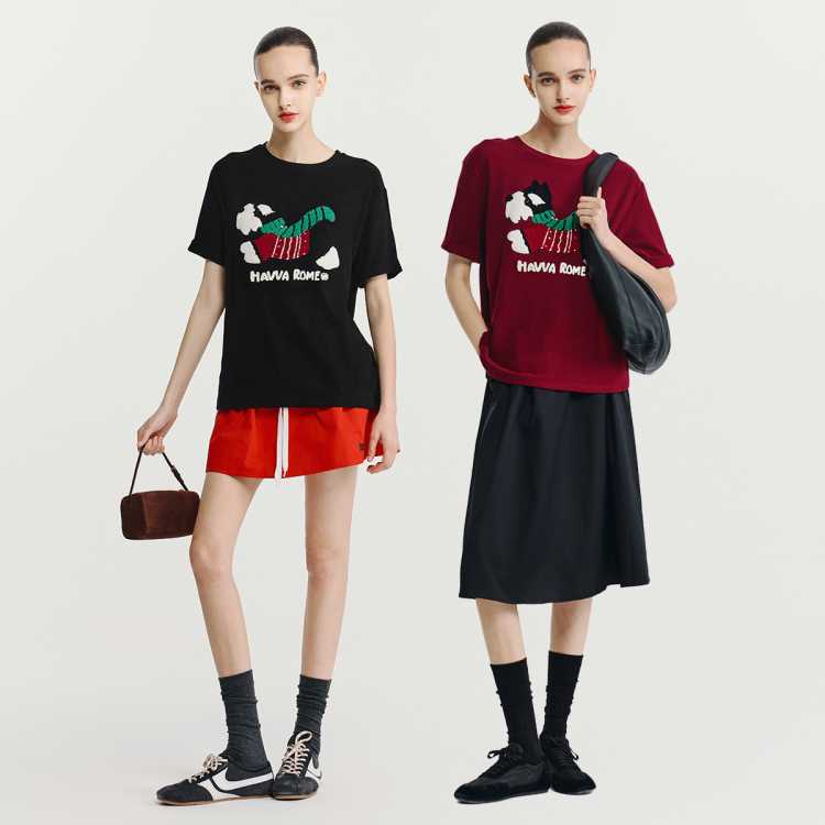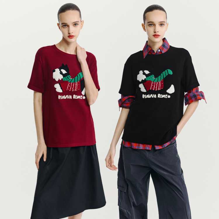 Havva 小众设计圆领短袖加绒加厚T恤卡通图案女士上衣2026年春季