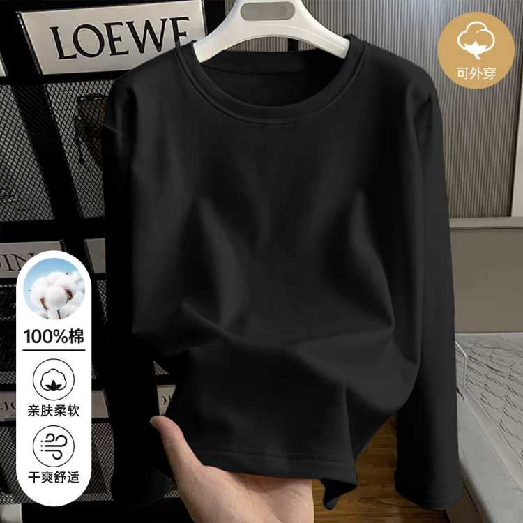 浪莎 【100%纯棉】宽松大码女式长袖圆领T恤纯色打底衫t恤女