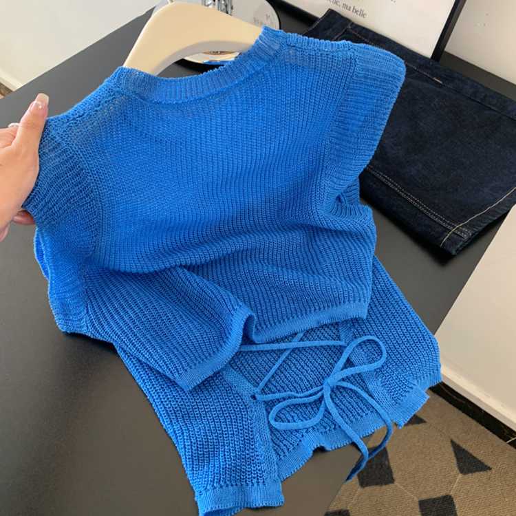 帕兰朵 灰色高级感短袖T恤女春夏修身显瘦针织衫设计感后背绑带上衣
