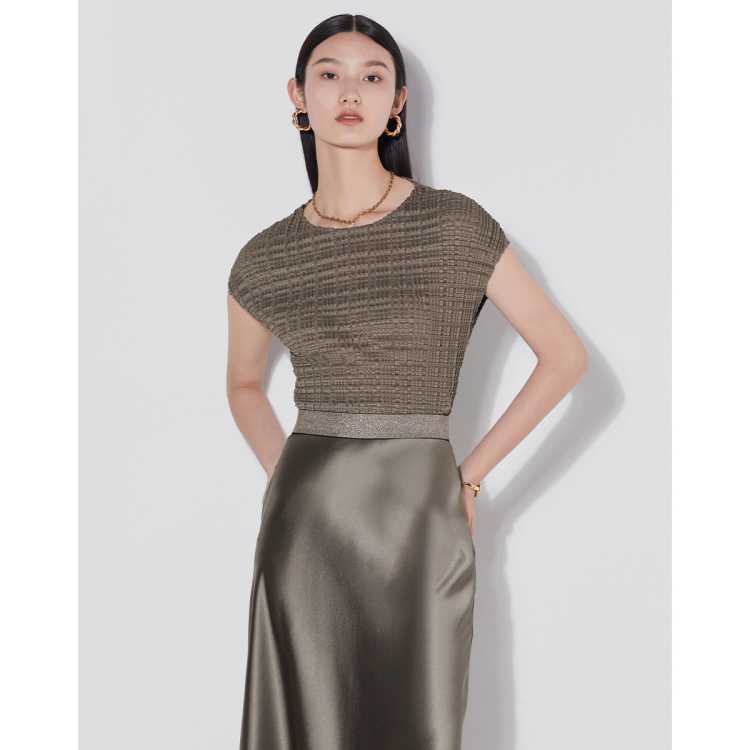 曼德诗 设计感韩版显瘦百搭圆领修身短袖上衣女夏季时尚微光褶皱复古小衫