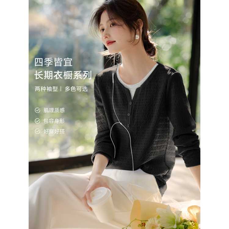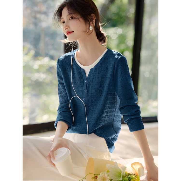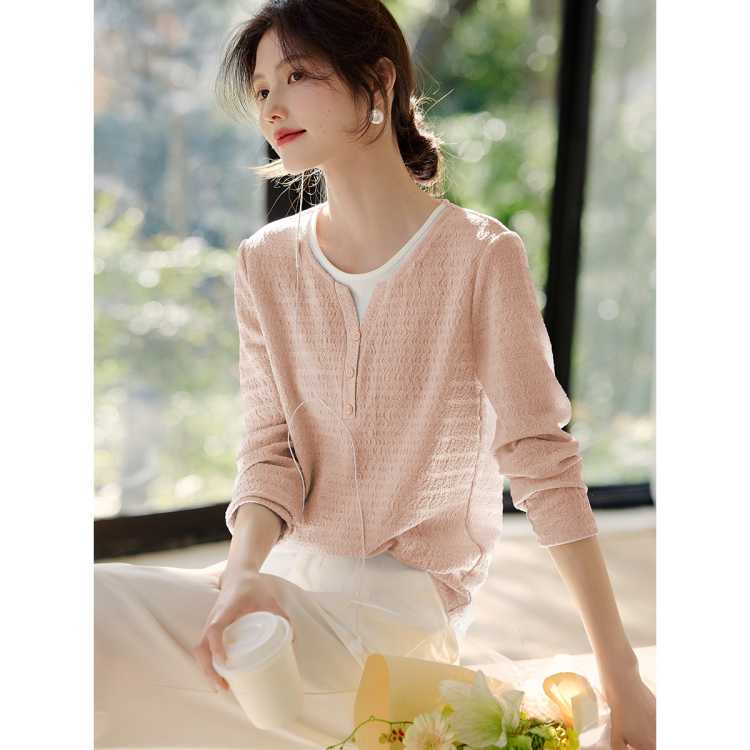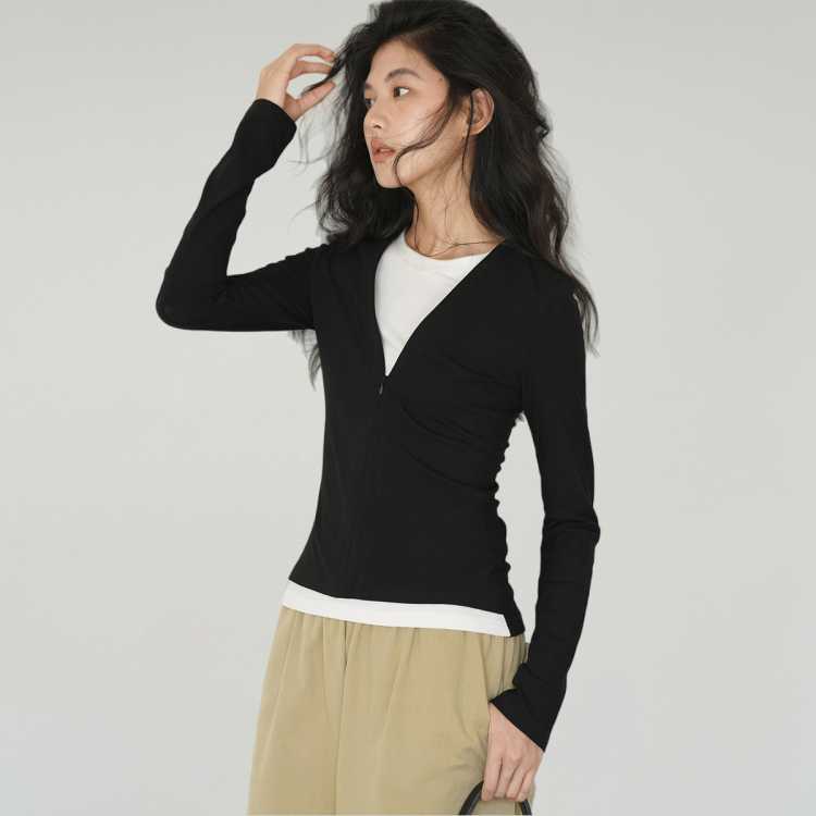 XWI欣未 【拼接之美】春季新知性假两件拼接拼色褶皱肌理长袖T恤