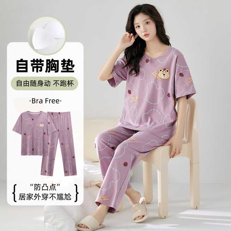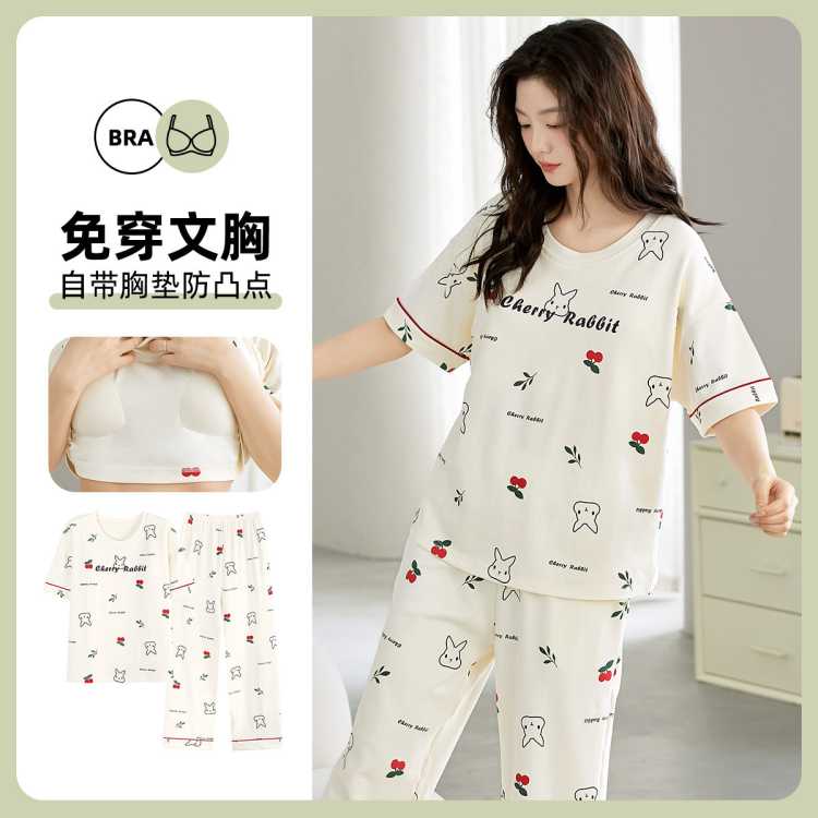 莫代尔 睡衣女带胸垫短袖长裤套装条纹萌趣小猫印花绵柔舒适可外穿