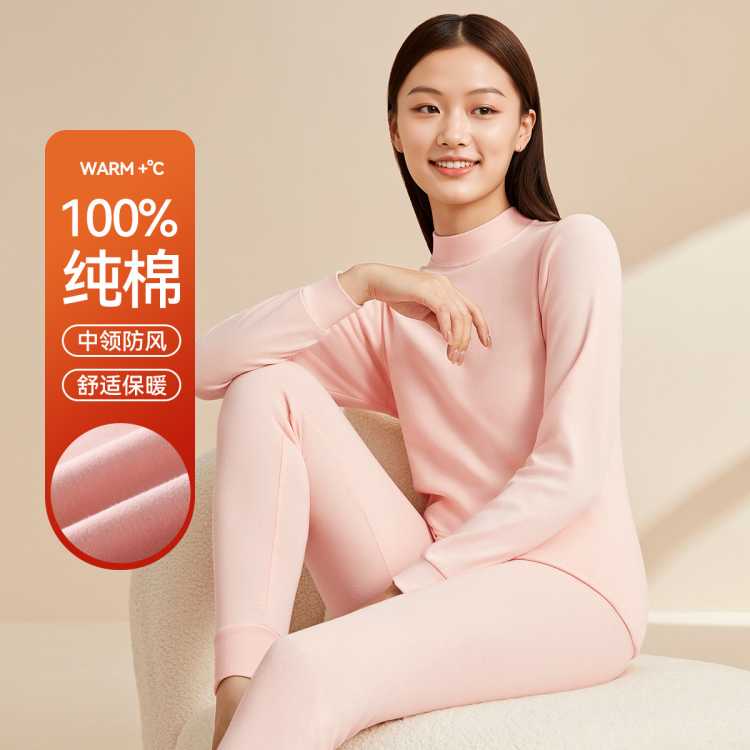 顶瓜瓜 【中领防风】100%纯棉女士保暖内衣套装大红打底棉毛秋衣秋裤