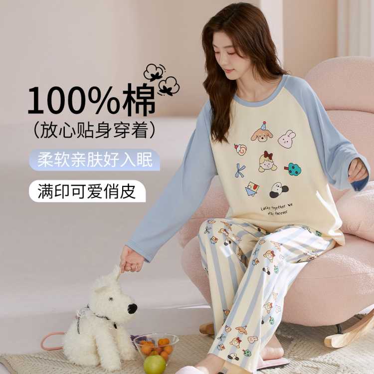 古今 【100%棉】可爱风柔软纯棉女士睡衣秋冬款长袖套装可外穿学生