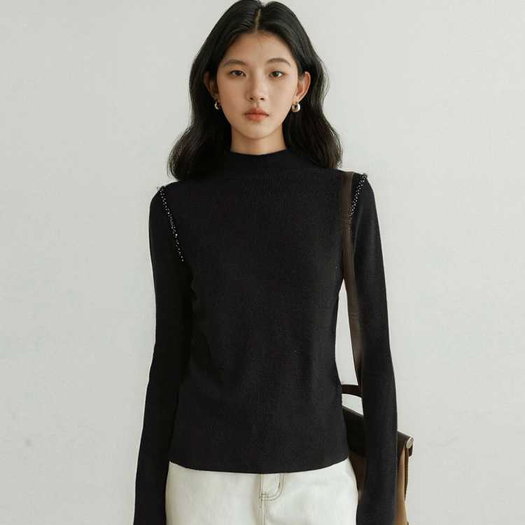 GLORY SEED 半高领软糯针织衫女2025秋冬气质镶钻装饰针织上衣长袖毛衣